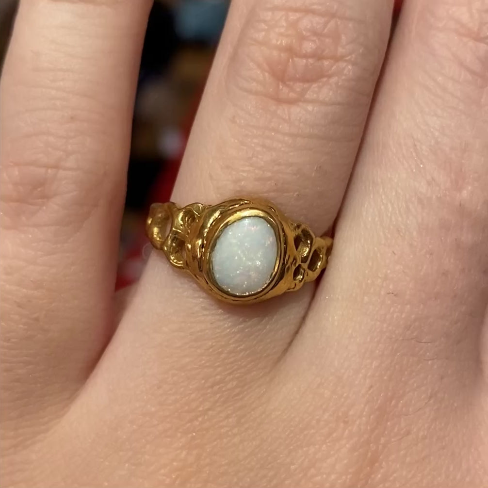 The rounded, sculptural texture gives the ring a sense of movement and whimsy, while the opal’s shifting hues add a dreamy, almost otherworldly glow. Each curve feels natural and spontaneous, making this piece a celebration of imperfection and light.