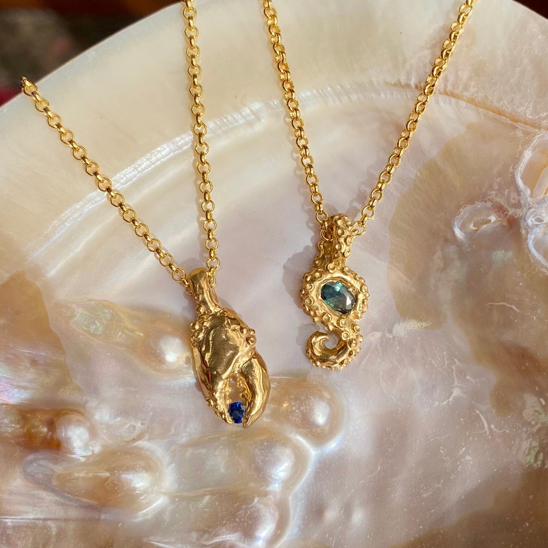 Celebrate the spirit of the sea with the Crab Claw Necklace, a striking handmade piece that captures the essence of coastal beauty. Crafted from gold-plated sterling silver, the pendant features a meticulously detailed crab claw, symbolizing strength and resilience. Nestled within its grasp is a stunning blue sapphire, shimmering like the ocean’s depths.