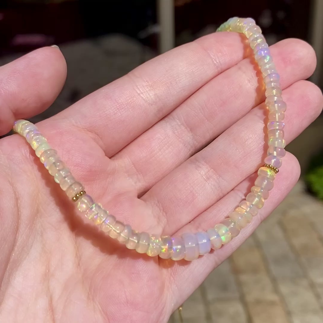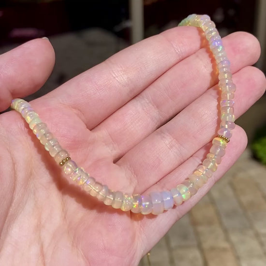 Glowing with an otherworldly shimmer, the Luminous Tide collier captures the magic of bioluminescence in water - that fleeting glow where light and tide become one. A strand of radiant Ethiopian opal beads sits close to the neck, their play-of-color revealing flashes of green, blue, and fiery orange with every movement. Between them, delicate gold accent beads add warmth and rhythm, like sunlight sparkling on the water’s surface.