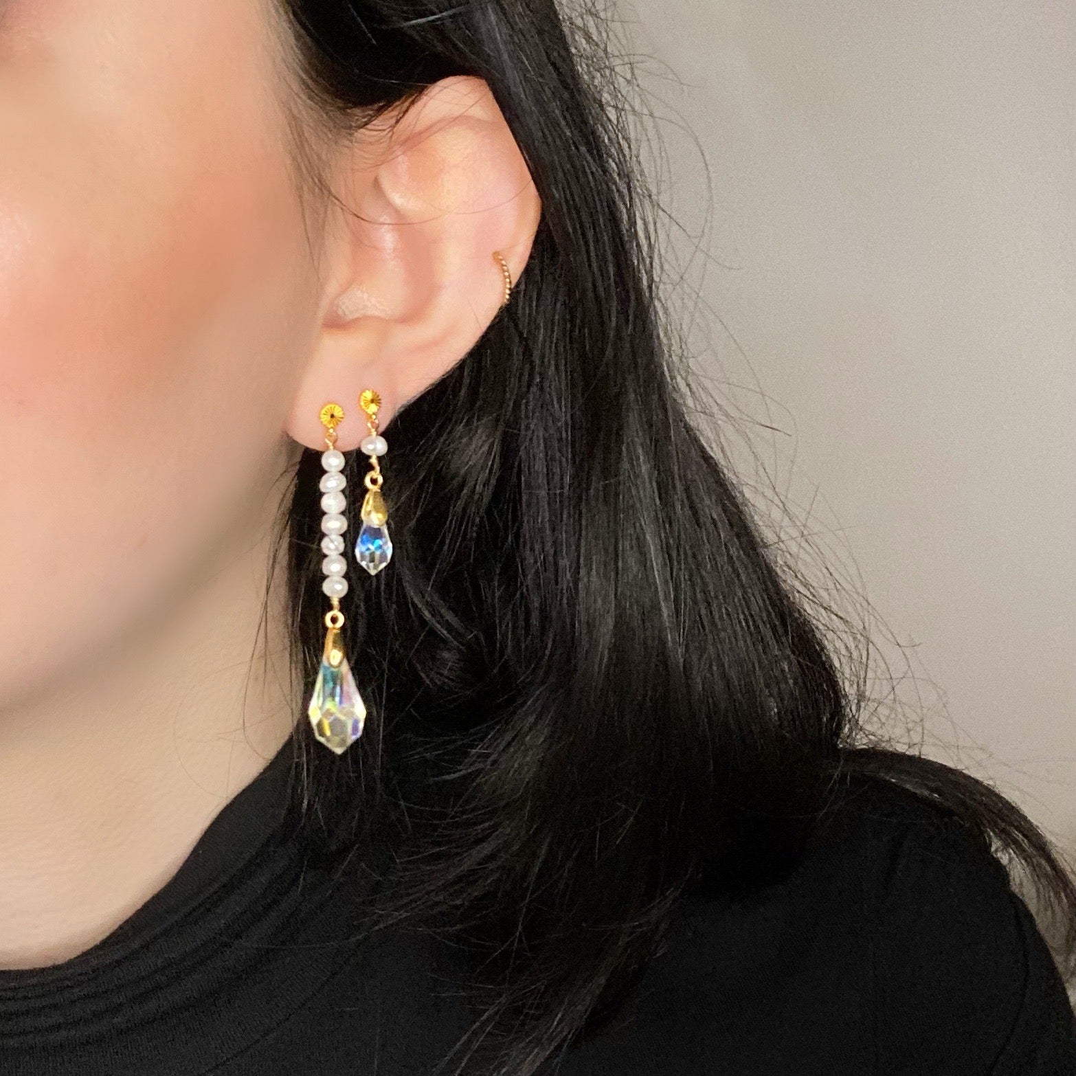 Sparkling crystal drops are combined with lustrous freshwater pearls to create a unique and outstanding look.
