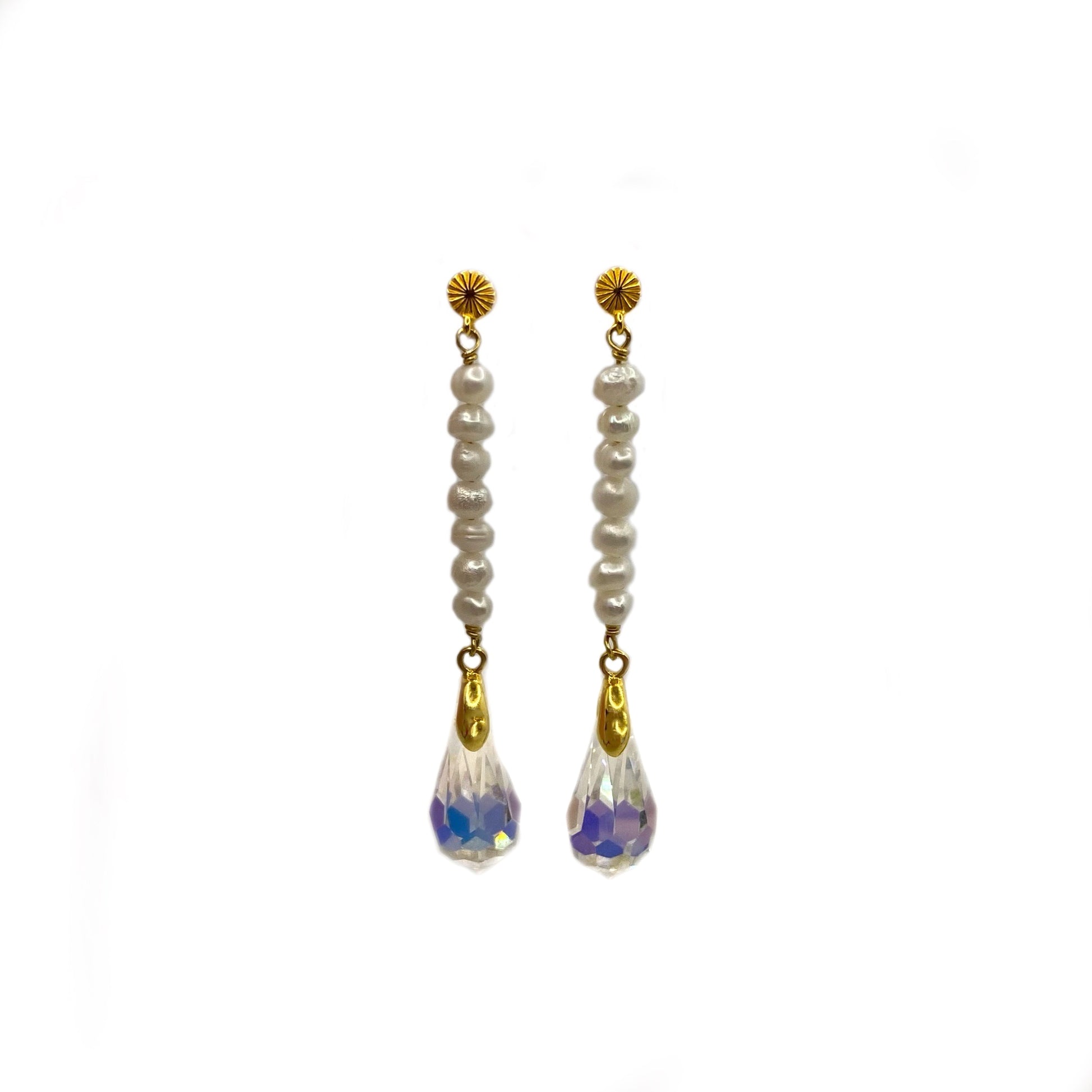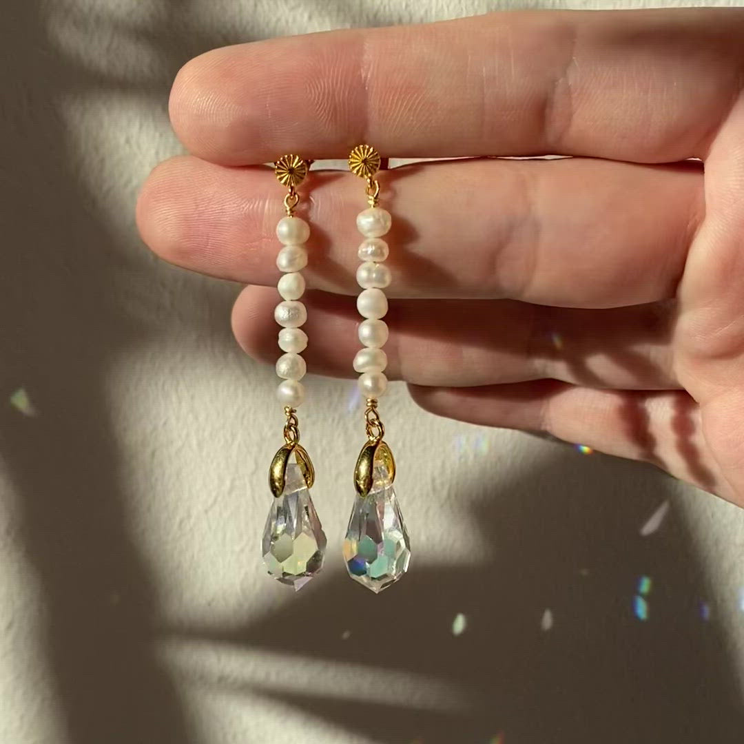 Sparkling crystal drops are combined with lustrous freshwater pearls to create a unique and outstanding look.