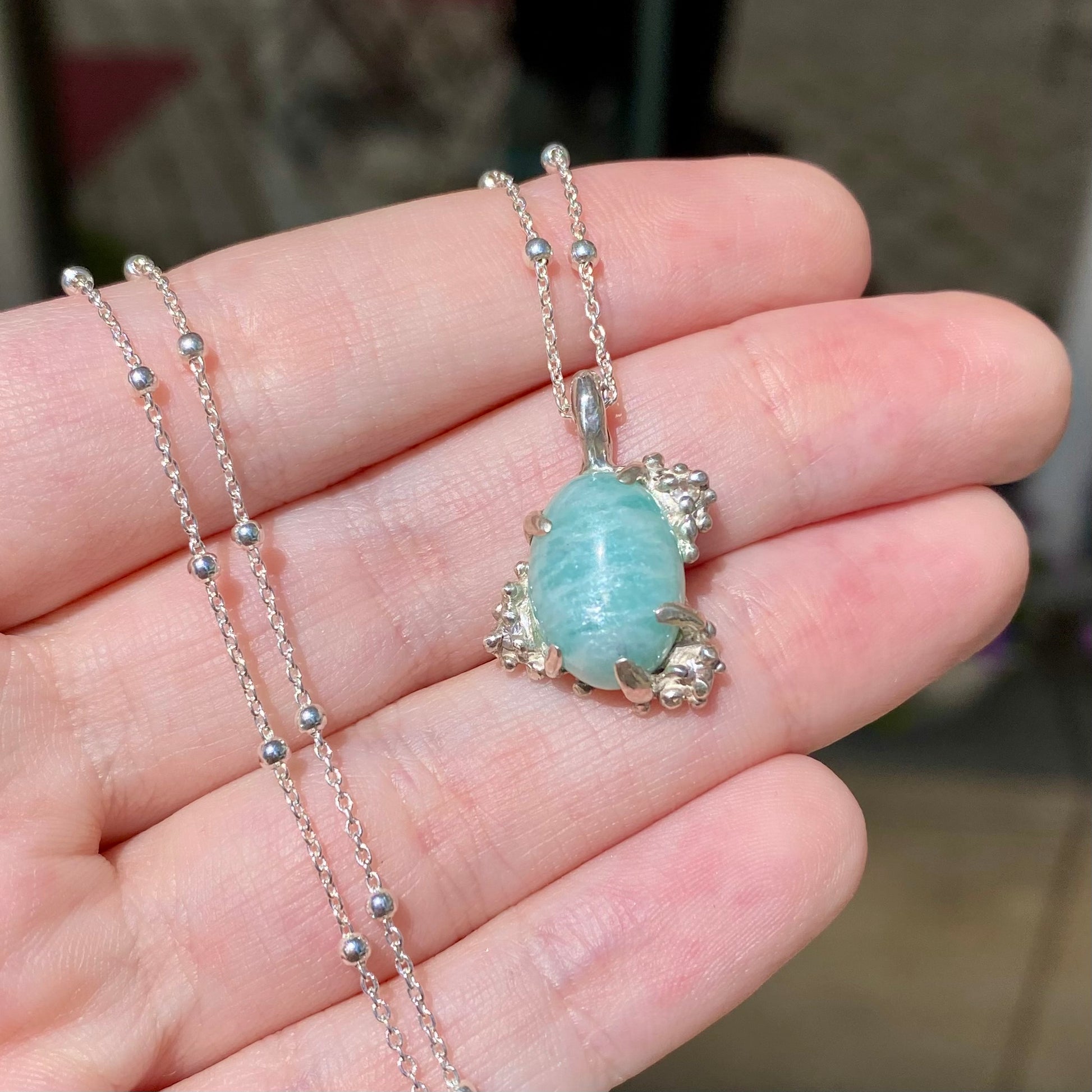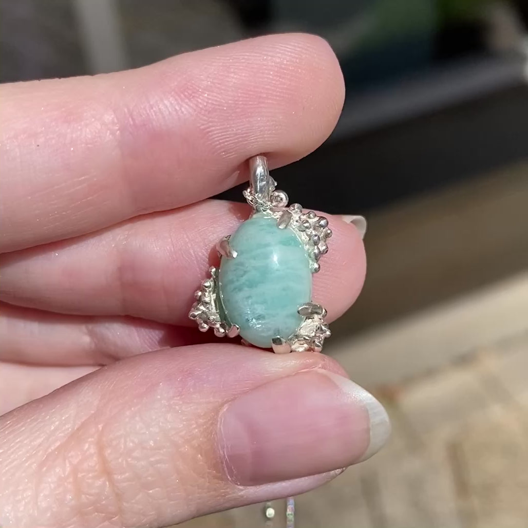 Evoke the serene power of the sea with the Siren Song Necklace, a one-of-a-kind piece inspired by the quiet magic of ocean depths. At its center rests a shimmering amazonite cabochon, its tranquil sea-green hue echoing calm tides and coastal skies.